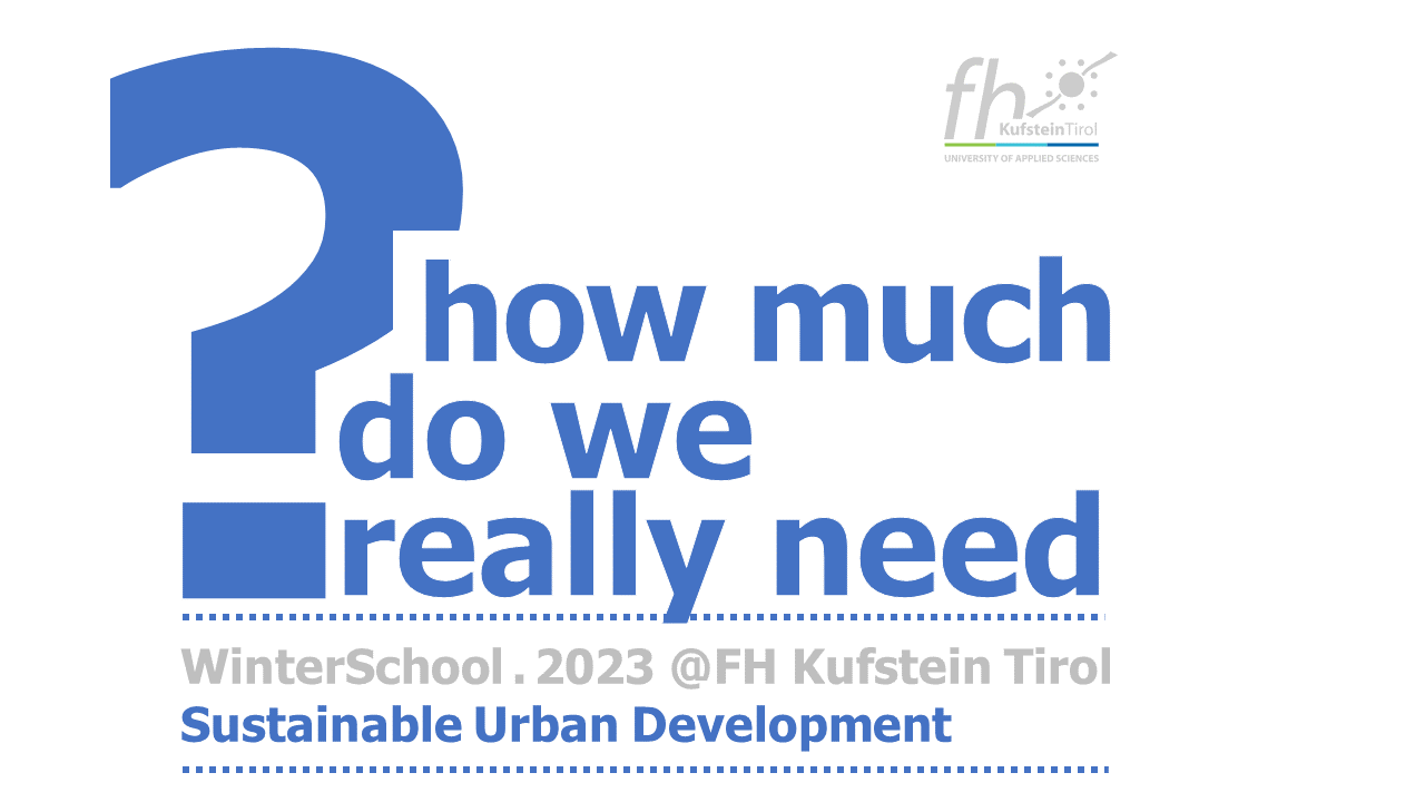 A region that has committed itself to the path of sustainability can be found on our doorstep and Kufstein, like our university, is a part of it. One goal of the Euregio Inntal which includes the regions Kufstein (A), Kitzbühel (A), Rosenheim (D), Traunstein(D) is sustainable living with decentralized & renewable energy production and the supply of regional food. And it is exactly on this topic that we want to develop ideas together in the 12th WinterSchool 2023. It is all about sustainable urban development which brings together the disciplines of real estate, energy, sustainability and facility management.